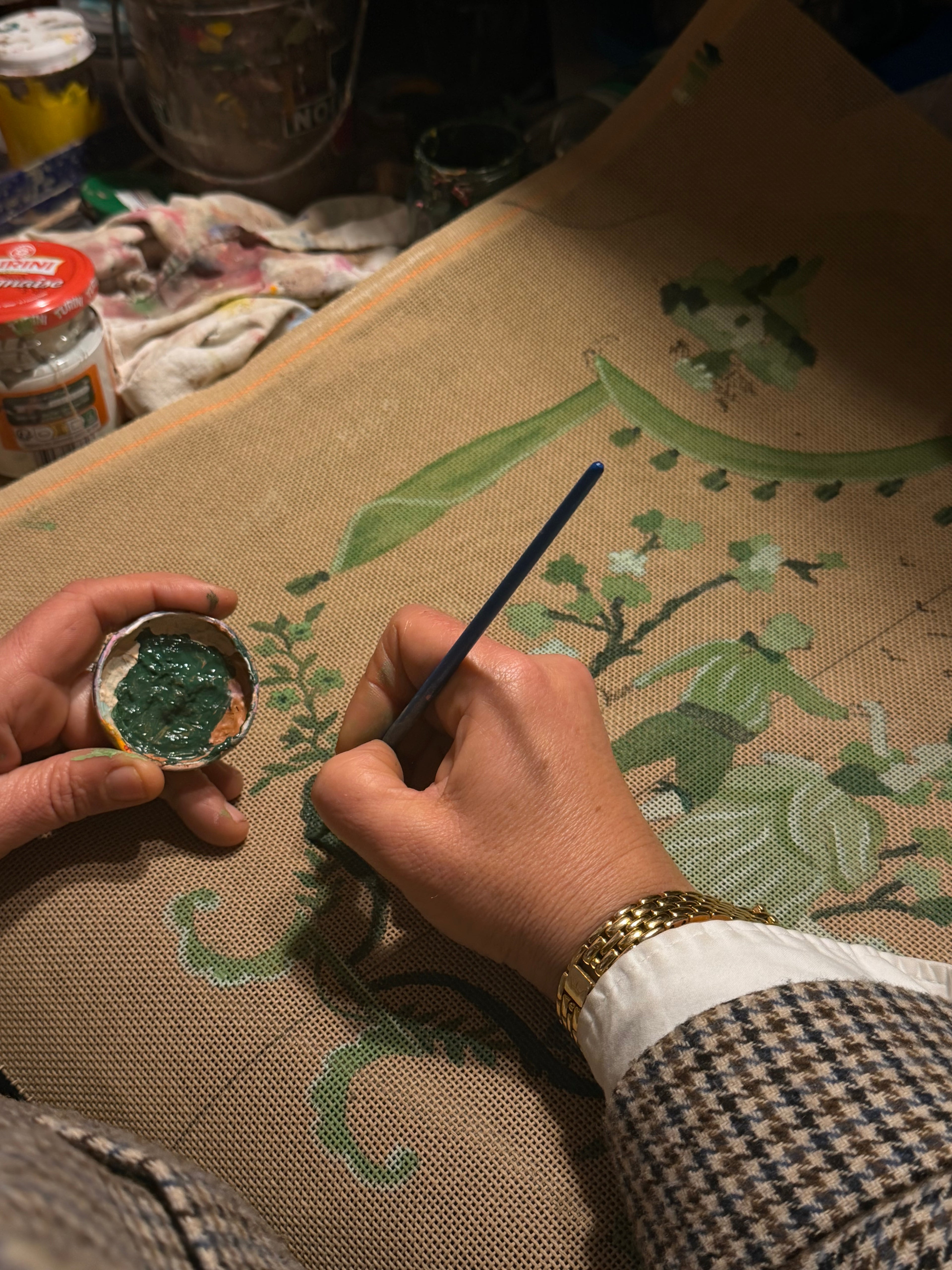Each canvas is hand-painted to create a unique tapestry.